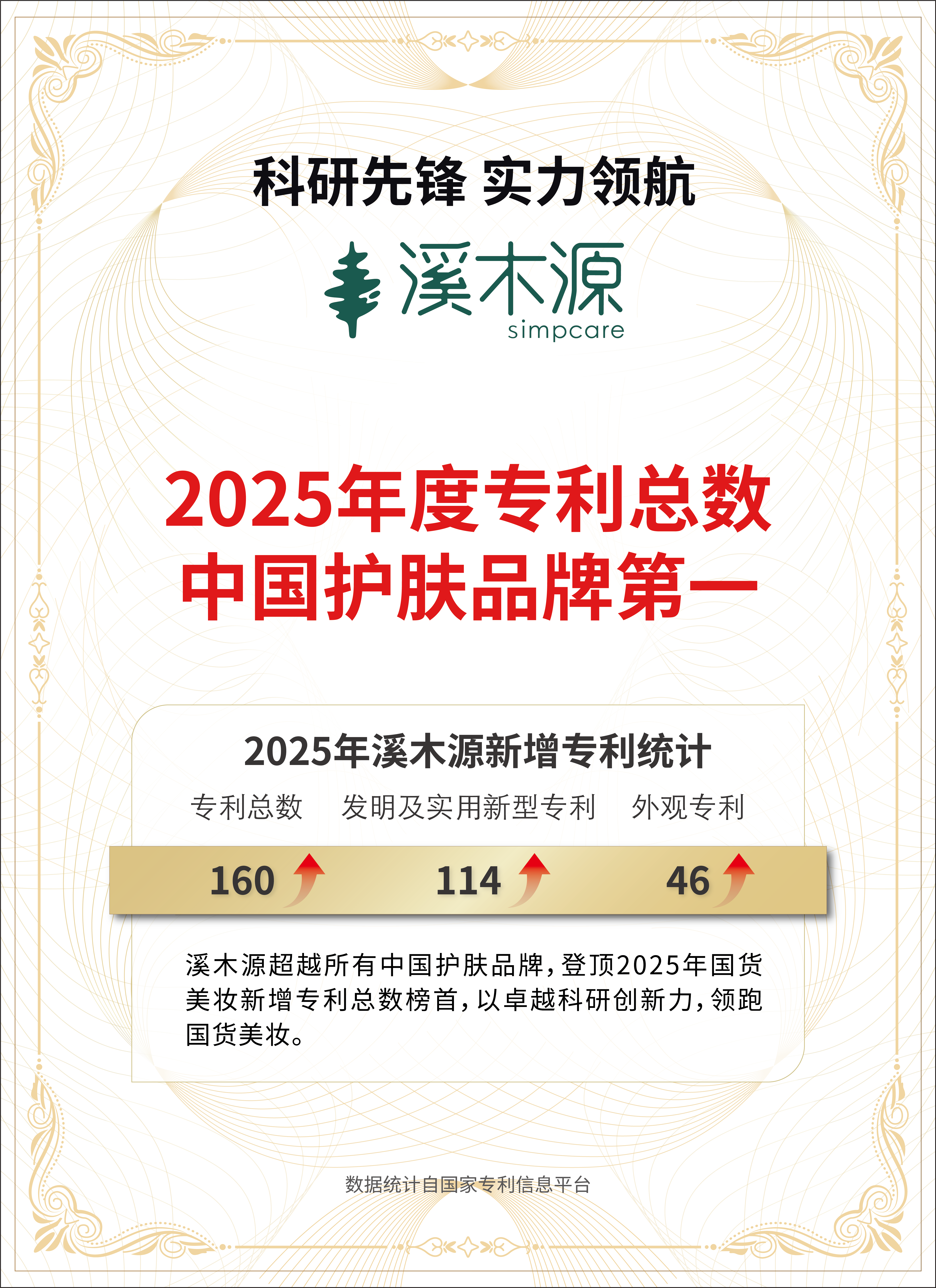 亮眼的市场表现和产品口碑的背后是溪木源对科研创新的极致追求,亦是始终贯彻“从科研到临床”的研发方针,打造医研共创的全链路敏感肌专研体系的有力体现。在CiE展会现场的「敏肌课堂」——敏感肌护理的创新突破与科学实证的分享中,溪木源研发合伙人、研发总经理张建华亮出了品牌最新的科研成绩单——截至2026年2月底,溪木源已累计获得477项专利授权及申请,发表核心学术论文60篇,主导及参与制定37项国家、行业、团体标准,涵盖中国首个敏感肌团体标准,推动行业向规范化和专业化发展。据国家专利信息平台统计,2025年溪木源新增专利总数达160项,位居中国护肤品牌第一,彰显绝对的研发创新能力。在此次展会上,溪木源荣膺2026CiE创新美妆大赏《年度最具创新力护肤品牌》奖项,其创新实力再次获得行业认可。