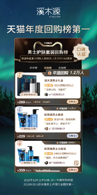 2023年12月,在溪木源极光黑云杉男士专研系列产品上市一周年之际,就一举拿下天猫“男士护肤套装”年度回购榜第一的成绩,超越了欧莱雅等国际大牌。同年的“双11”,该系列产品也问鼎男士护理行业国货排行榜第一名。意料之外的成绩,让溪木源迅速站在行业聚光灯下,代表广东国货品牌,实现与国际品牌的同台竞技。
